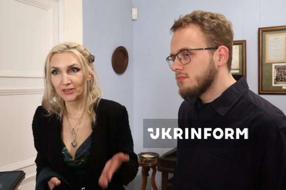Завідувачка науково-дослідницького відділу музею "Іван Франко і Київ" Люцина Ольховська та старший науковий співробітник Музею видатних діячів української культури Марко Мілютін проводять екскурсію постійною експозицією, що висвітлює київський період життя, творчості та громадської діяльності українського письменника Івана Франка, у Меморіальному будинку-музеї Лесі Українки, який входить до комплексу Музею видатних діячів української культури, Київ, 1 квітня 2026 року. Серед експонатів представлено унікальні матеріали про особисте життя письменника, його творчі контакти з київською інтелігенцією, а також документи, що висвітлюють долю його дітей - Тараса, Петра та Анни Франків.