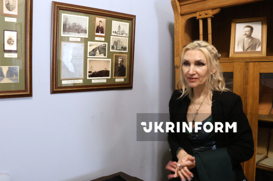Завідувачка науково-дослідницького відділу музею "Іван Франко і Київ" Люцина Ольховська проводить екскурсію постійною експозицією, що висвітлює київський період життя, творчості та громадської діяльності українського письменника Івана Франка, у Меморіальному будинку-музеї Лесі Українки, який входить до комплексу Музею видатних діячів української культури, Київ, 1 квітня 2026 року. Серед експонатів представлено унікальні матеріали про особисте життя письменника, його творчі контакти з київською інтелігенцією, а також документи, що висвітлюють долю його дітей - Тараса, Петра та Анни Франків.