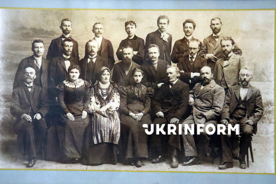 Групове фото учасників з’їзду українських письменників з нагоди 100-річчя виходу у світ «Енеїди» Івана Котляревського у Львові, експонується в межах постійної експозиції "Іван Франко і Київ", що висвітлює київський період життя, творчості та громадської діяльності українського письменника Івана Франка, експонується у Меморіальному будинку-музеї Лесі Українки, який входить до комплексу Музею видатних діячів української культури, Київ, 1 квітня 2026 року. Серед експонатів представлено унікальні матеріали про особисте життя письменника, його творчі контакти з київською інтелігенцією, а також документи, що висвітлюють долю його дітей - Тараса, Петра та Анни Франків.