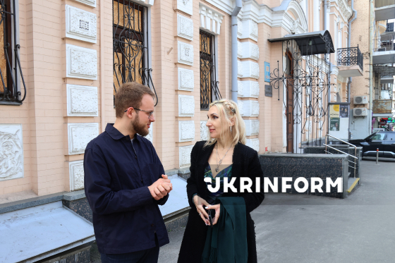 Завідувачка науково-дослідницького відділу музею "Іван Франко і Київ" Люцина Ольховська та старший науковий співробітник Музею видатних діячів української культури Марко Мілютін спілкуються біля Меморіального будинку-музею Лесі Українки Музею видатних діячів української культури, де експонується постійна експозиція "Іван Франко і Київ", Київ, 1 квітня 2026 року.