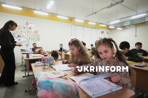 Вчителька проводить урок з української мови в одному з навчальних класів нової підземної школи у місті Балаклія Ізюмського району Харківської області, розташованому недалеко від зони бойових дій та кордону з Росією, 1 квітня 2026 року. У підземному освітньому просторі навчатимуться близько 600 дітей з двох шкіл. Упродовж усього дня у школі перебуватиме поліціянт, а чергові вчителі відповідають за зустріч та проводжання школярів.