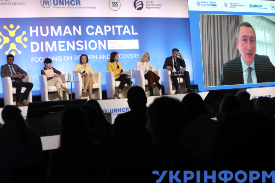 Провідний економіст та керівник програм Світового банку з людського розвитку у Східній Європі Нітін Умапаті, заступниця керівника Офісу Президента України Олена Ковальська, міністр праці та соціальної політики України Оксана Жолнович, заступниця міністра закордонних справ України Марʼяна Беца, представниця Агентства ООН у справах біженців (УВКБ ООН) в Україні Кароліна Ліндхольм-Біллінг і модератор Вадим Карпʼяк (зліва направо) та віцепрем’єр-міністр - міністр національної єдності України Олексій Чернишов (онлайн) під час всеукраїнського форуму "Human capital dimension at the URC 2025. Focusing on Return and Recovery", присвяченого формуванню довгострокових рішень у сфері людського капіталу, підтримці ВПО та українців за кордоном, Київ, 17 червня 2025 року. Онлайн-виступ віцепрем’єр-міністра - міністра національної єдності України Олексія Чернишова транслюєтьс на екрані під час дискусійної панелі у межах Всеукраїнського форуму "Human capital dimension at the URC 2025. Focusing on Return and Recovery", присвяченого формуванню довгострокових рішень у сфері людського капіталу, підтримці ВПО та українців за кордоном, Київ, 17 червня 2025 року.