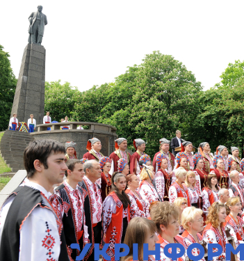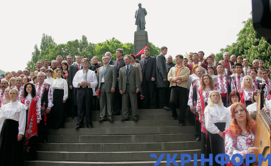 Учасники Шевченківського літературно-мистецького свята "В сім’ї вольній, новій" вшанували пам’ять Великого Кобзаря та відзначили річницю перепоховання праху Тараса Шевченка на Чернечій горі, Канів, Черкаська область, 22 травня 2005 року. Фото Миколи Лазаренка.