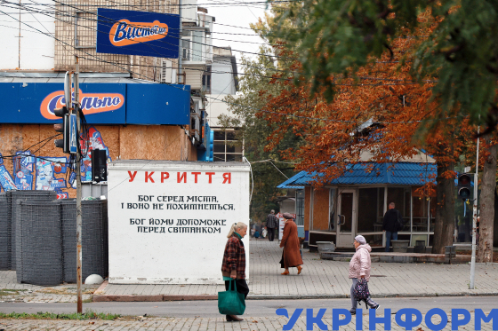 Жінки йдуть повз бетонне укриття на міській вулиці в одному з районів прифронтового Херсона, 2 жовтня 2025 року.