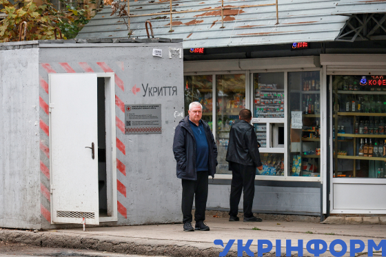 Чоловіки стоять біля бетонного укриття на зупинці громадського транспорту у прифронтовом Херсоні, 2 жовтня 2025 року.