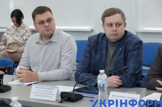Директор Галузевого державного архіву Українського інституту національної пам’яті Ігор Кулик (ліворуч) і співробітник Центру стратегічних комунікацій та інформаційної безпеки Максим Майоров під час засідання "круглого столу" на тему: "Презентація соціологічного опитування та наукового дослідження про генерала УПА "Справа Шухевича"", Київ, 27 жовтня 2023 року.