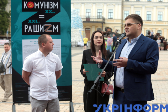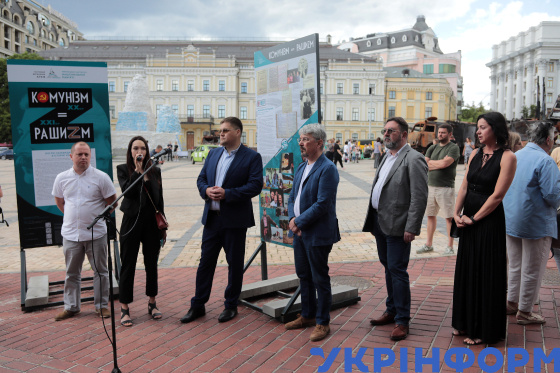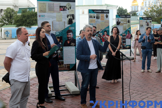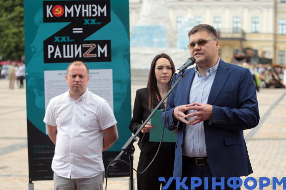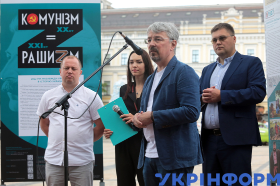 Міністр культури та інформаційної політики України Олександр Ткаченко (другий праворуч) поруч з директором Галузевого державного архіву Українського інституту національної пам’яті Ігорем Куликом (праворуч) і в. о. голови Українського інституту національної пам’яті Максимом Ярмистим (ліворуч) виступає з промовою під час відкриття вуличної фотодокументальної виставки "Комунізм = рашизм", яка висвітлює приклади російської агресії, на Михайлівській площі, Київ, 15 червня 2023 року.