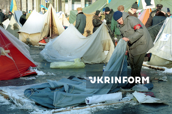 За рішенням суду Старокиївського району міста Києва, наметове містечко, встановлене на Майдані Незалежності під час акції протесту "Україна без Кучми", згортається напередодні новорічних та різдвяних свят, Київ, 23 грудня 2000 року. Фото Івана Біленка.