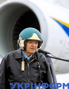 Командир першого екіпажу Ан-124 "Руслан", заслужений льотчик-випробувач, пілот цивільної авіації I-го класу, майстер спорту міжнародного класу Володимир Терський під час урочистостей із нагоди 35-річчя першого польоту військово-транспортного вантажного літака Ан-124 "Руслан" виступає з промовою на території аеродрому "Київ-Антонов-2", смт Гостомель, Київська область, 22 грудня 2017 року. Фото Володимира Тарасова.