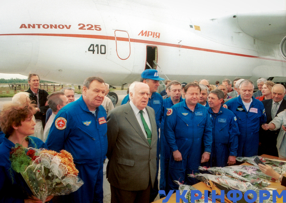 Заступник генерального директора Авіаційного науково-технічного комплексу (АНТК) імені Олега Антонова Анатолій Буланенко (третій ліворуч) та члени екіпажу надважкого транспортного літака Ан-225 "Мрія" на чолі з командиром, провідним пілотом-випробувачем, майстром спорту міжнародного класу Олександром Галуненком (четвертий ліворуч) спілкуються з представниками ЗМІ після завершення польоту за маршрутом "Київ-Чорне море-Київ" із рекордним вантажем на борту, Київ, 11 вересня 2001 року. Фото Сергія Кузнецова.