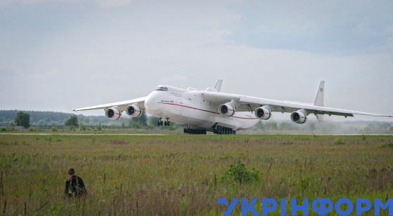 Український надважкий транспортний літак Ан-225 "Мрія" здійснює посадку на аеродромі "Київ-Антонов" після демонстраційного польоту під час 5-го Міжнародного авіаційно-космічного салону "Авіасвіт-ХХІ", смт Гостомель, Київська область, 9 червня 2006 року. Фото Володимира Тарасова.