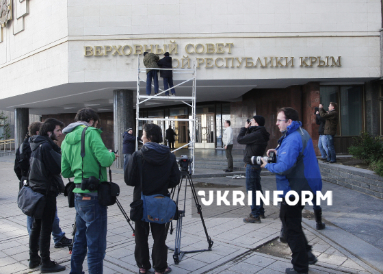 Журналісти фіксують процес демонтажу державних написів українською, російською та кримськотатарською мовами з фасаду будівлі Верховної Ради Автономної Республіки Крим та появу таблички з написом "Государственный Совет Республики Крым" у зв’язку з перейменуванням держустанови у дні анексії півострова, Сімферополь, АР Крим, 18 березня 2014 року. Фото Арвідаса Шеметаса.