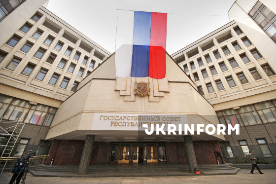 Встановлена нова назва "Государственный Совет Республики Крым" на фасаді будівлі парламенту Криму у зв’язку з перейменуванням держустанови у дні анексії півострова, колишню назву "Верховна Рада Автономної Республіки Крим" було демонтовано, Сімферополь, АР Крим, 18 березня 2014 року. Фото Арвідаса Шеметаса.