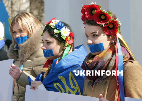 Учасники мітингу проти цензури та обмежень свободи слова і доступу до інформації біля пам’ятника Тарасові Шевченку вимагають негайного виведення російських військ із території півострова, Сімферополь, АР Крим, 13 березня 2014 року. Фото Арвідаса Шеметаса.