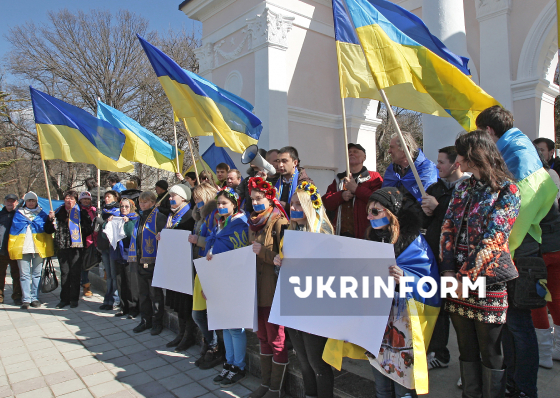 Учасники мітингу проти цензури та обмежень свободи слова і доступу до інформації біля пам’ятника Тарасові Шевченку вимагають негайного виведення російських військ із території півострова, Сімферополь, АР Крим, 13 березня 2014 року. Фото Арвідаса Шеметаса.