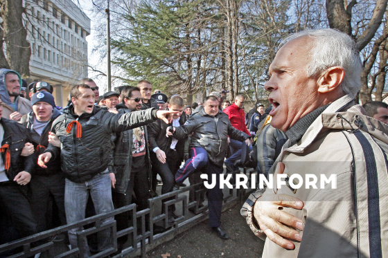 Правоохоронець під час стихійного мітингу біля будівлі Верховної Ради Автономної Республіки Крим намагається завадити сутичці між проросійськи налаштованими жителями півострова (ліворуч) та активістами, які виконують Гімн України, АР Крим, Сімферополь, 21 лютого 2014 року. Фото Арвідаса Шеметаса.