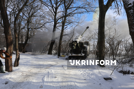 Боєць 48-ї окремої артилерійської бригади імені полковника Армії УНР Григорія Чижевського виконує постріл із вітчизняної самохідної артилерійської установки 2С22 "Богдана", яку використовують для виконання бойових завдань на Харківському напрямку, 9 лютого 2026 року.