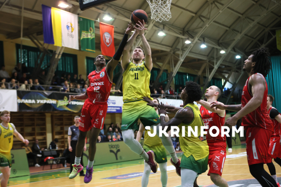 Ігровий момент першого матчу 1/4 фіналу чемпіонату України з баскетболу серед команд Суперліги між БК “Рівне” і БК “Прикарпаття-Говерла” (Івано-Франківськ), що завершився з рахунком 79:71 на користь рівненської команди, у манежі КФВ, Івано-Франківськ, 4 квітня 2026 року.