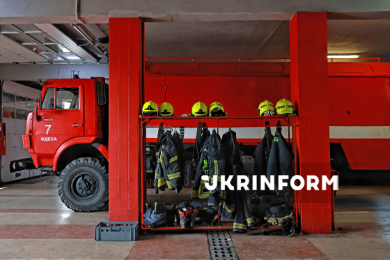 Пожежний автомобіль на території однієї з пожежних частин міста, Одеса, 24 березня 2026 року. Рятувальники Олександр Микитюк-старший та Олександр Микитюк-молодший, батько та син, служать у різних підрозділах ДСНС та відповідають за різні райони міста.