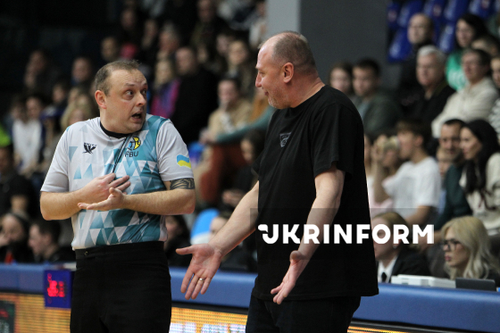 Головний тренер БК "Дніпро" Володимир Коваль розмовляє з арбітром під час першого матчу 1/4 фіналу чемпіонату України з баскетболу серед команд Суперліги між БК “Дніпро” і БК “Черкаські Мавпи”, що завершився з рахунком 93:62 на користь дніпровської команди, у СК “Шинник”, Дніпро, 4 квітня 2026 року.