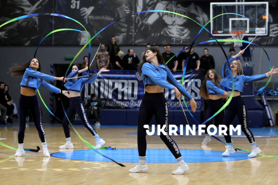 Група підтримки виступає під час першого матчу 1/4 фіналу чемпіонату України з баскетболу серед команд Суперліги між БК “Дніпро” і БК “Черкаські Мавпи”, що завершився з рахунком 93:62 на користь дніпровської команди, у СК “Шинник”, Дніпро, 4 квітня 2026 року.