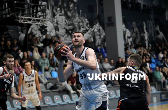 Гравець БК “Дніпро” Сергій Загреба стрибає з м`ячем у руках під час першого матчу 1/4 фіналу чемпіонату України з баскетболу серед команд Суперліги між БК “Дніпро” і БК “Черкаські Мавпи”, що завершився з рахунком 93:62 на користь дніпровської команди, у СК “Шинник”, Дніпро, 4 квітня 2026 року.