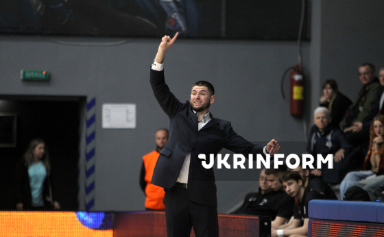 Головний тренер БК “Черкаські Мавпи” Дмитро Нагорний спостерігає за матчем 1/4 фіналу чемпіонату України з баскетболу серед команд Суперліги між БК “Дніпро” і БК “Черкаські Мавпи”, що завершився з рахунком 93:62 на користь дніпровської команди, у СК “Шинник”, Дніпро, 4 квітня 2026 року.