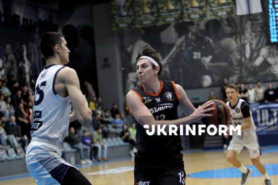 Гравець БК “Черкаські Мавпи” Даниїл Пирогов біжить з м`ячем у руках під час першого матчу 1/4 фіналу чемпіонату України з баскетболу серед команд Суперліги між БК “Дніпро” і БК “Черкаські Мавпи”, що завершився з рахунком 93:62 на користь дніпровської команди, у СК “Шинник”, Дніпро, 4 квітня 2026 року.