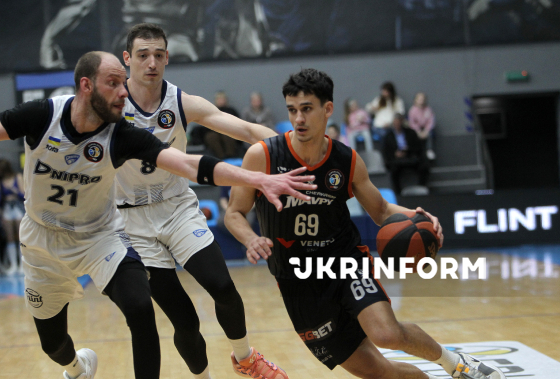 Гравець БК “Дніпро” Станіслав Тимофеєнко (ліворуч) і гравець БК “Черкаські Мавпи” Лев Кошеватський біжать під час першого матчу 1/4 фіналу чемпіонату України з баскетболу серед команд Суперліги між БК “Дніпро” і БК “Черкаські Мавпи”, що завершився з рахунком 93:62 на користь дніпровської команди, у СК “Шинник”, Дніпро, 4 квітня 2026 року.