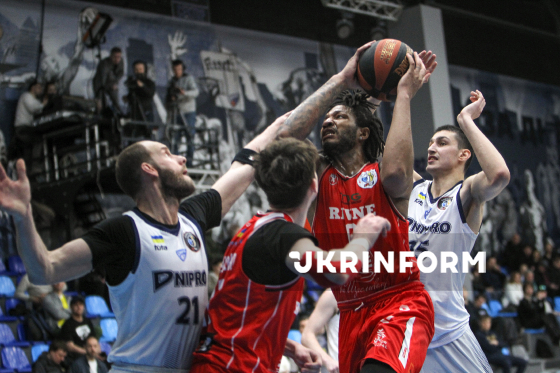 Гравець БК “Рівне” Джейлен Дюпрі кидає м`яч у баскетбольне кільце під час матчу чемпіонату України з баскетболу серед команд Суперліги між командами “Дніпро” і “Рівне”, що завершився з рахунком 86:68 на користь команди з Дніпра, Дніпро, 28 березня 2026 року.
