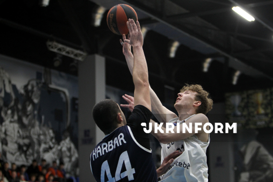 Ігровий момент першого матчу 1/4 фіналу чемпіонату України з баскетболу серед команд Суперліги між БК “Харківські Соколи” (Харків) і БК “Ніко-Баскет” (Миколаїв), що завершився з рахунком 89:81 на користь харківської команди, у СК “Шинник”, Дніпро, 4 квітня 2026 року.