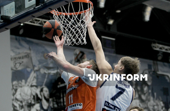 Гравці БК "Дніпро" Іван Дружелюбов та БК "Черкаські Мавпи" Максим Голенков (ліворуч) беруть участь у матчі чемпіонату України з баскетболу серед команд Суперліги, що завершився перемогою господарів з рахунком 101:70, у залі СК "Шинник", Дніпро, 31 січня 2026 року.