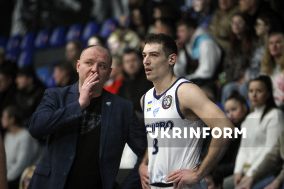 Головний тренер БК "Дніпро" Володимир Коваль (ліворуч) спілкується з гравцем команди Євгенієм Сорочаном під час матчу чемпіонату України з баскетболу серед команд Суперліги проти БК "Харківські Соколи", що завершився перемогою господарів з рахунком 98:58, у залі СК "Шинник", Дніпро, 28 лютого 2026 року. Гру розпочали ще 1 лютого, але через повітряну тривогу матч було зупинено за 7:47 до кінця другої чверті за рахунку 35:11 на користь дніпрян.