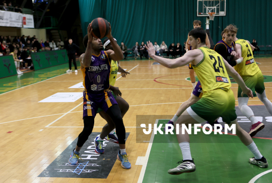 Ігровий момент матчу чемпіонату України з баскетболу серед команд Суперліги між івано-франківським БК "Прикарпаття-Говерла" (жовта форма) та БК "Старий Луцьк", що завершився перемогою господарів майданчика з рахунком 90:77, Дніпро, 31 січня 2026 року.