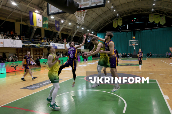 Ігровий момент матчу чемпіонату України з баскетболу серед команд Суперліги між івано-франківським БК "Прикарпаття-Говерла" (жовта форма) та БК "Старий Луцьк", що завершився перемогою господарів майданчика з рахунком 90:77, Дніпро, 31 січня 2026 року.