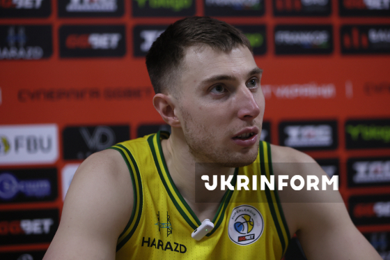 Гравець івано-франківського БК "Прикарпаття-Говерла" Сергій Старцев бере участь у пресконференції після матчу чемпіонату України з баскетболу серед команд Суперліги проти БК "Старий Луцьк", що завершився перемогою господарів майданчика з рахунком 90:77, Дніпро, 31 січня 2026 року.
