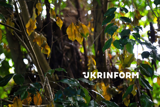 Фікус із пожовклим внаслідок перепадів темпаратури листям в оранжереї Національного ботанічного саду імені М. М. Гришка, який пройшов чергове випробування суворою воєнною зимою, Київ, 11 березня 2026 року. Через перебої з опаленням, спричинені російськими атаками на енергосистему України, у січні температура в експозиційних оранжереях опускалася до критичних позначок – -3°C (при нормі +15°C). Найбільше постраждали тропічні родини ароїдних та орхідних, проте видову різноманітність вдалося зберегти повністю. Київська колекція налічує понад 4 тисячі видів і з 1999 року має статус Національного надбання України.
