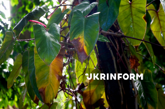 Пожовкле внаслідок температурних перепадів листя тропічної рослини в оранжереї Національного ботанічного саду імені М. М. Гришка, Київ, 11 березня 2026 року. Через перебої з опаленням, спричинені російськими атаками на енергосистему України, у січні температура в експозиційних оранжереях опускалася до критичних позначок – -3°C (при нормі +15°C). Найбільше постраждали тропічні родини ароїдних та орхідних, проте видову різноманітність вдалося зберегти повністю. Київська колекція налічує понад 4 тисячі видів і з 1999 року має статус Національного надбання України.
