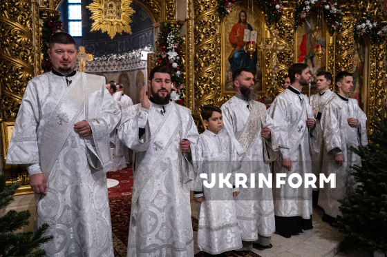 Священнослужителі беруть участь у ранковій божественній літургії з нагоди свята Різдва Христового, яку очолив Блаженнійший Митрополит Київський і всієї України Епіфаній, у кафедральному Свято-Михайлівському Золотоверхому соборі столиці, Київ, 25 грудня 2025 року.