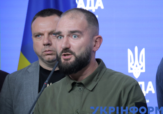 Члени Тимчасової спеціальної комісії Верховної Ради України з питань захисту майнових та немайнових прав внутрішньо переміщених та інших осіб, постраждалих внаслідок збройної агресії Російської Федерації проти України, Олександр Юрченко (праворуч) та Максим Ткаченко під час брифінгу у Верховній Раді України, Київ, 20 листопада 2024 року.