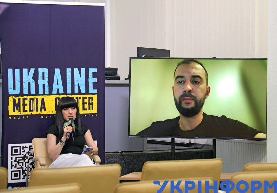 Модераторка Ольга Атаманова під час брифінгу очільника Державної інспекції ядерного регулювання (2017-2021 рр.) Григорія Плачкова (онлайн) на тему: "Наслідки руйнування підстанції в тимчасово окупованому Енергодарі та поточна ситуація на захопленій ЗАЕС" у Медіацентрі Україна - Укрінформ, Київ, 24 червня 2024 року.