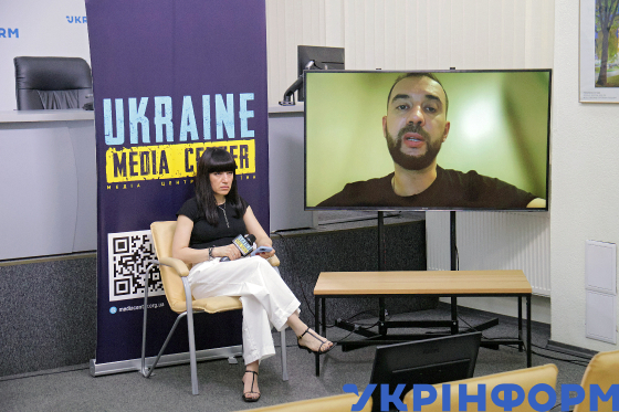 Модераторка Ольга Атаманова під час брифінгу очільника Державної інспекції ядерного регулювання (2017-2021 рр.) Григорія Плачкова (онлайн) на тему: "Наслідки руйнування підстанції в тимчасово окупованому Енергодарі та поточна ситуація на захопленій ЗАЕС" у Медіацентрі Україна - Укрінформ, Київ, 24 червня 2024 року.