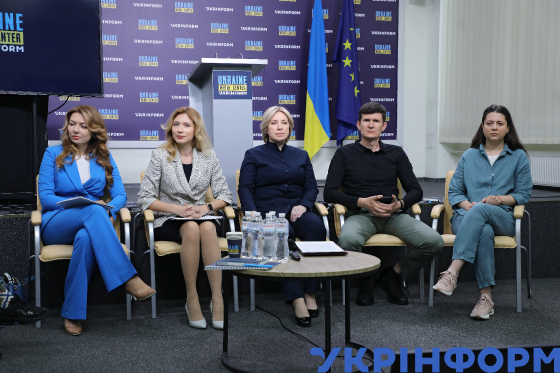 Голова Комітету сталого розвитку Федерації роботодавців України, голова Галузевої ради Федерації металургів України Олена Колеснікова, директорка Державного центру зайнятості Юлія Жовтяк, віцепрем’єр-міністр ‒ міністр з питань реінтеграції тимчасово окупованих територій України Ірина Верещук, заступник голови Закарпатської обласної державної адміністрації Петро Добромільський, виконавча директорка ГО “ГРУПА ВПЛИВУ” Вікторія Золотухіна (зліва направо) під час брифінгу на тему: “Державна підтримка внутрішньо переміщених осіб”, Київ, 29 червня 2023 року.