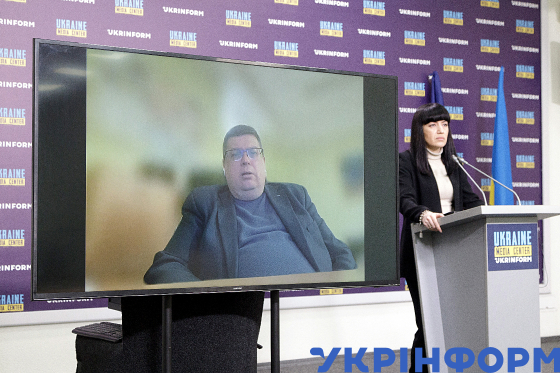 Віцепрезидент Асоціації міжнародних автоперевізників Володимир Балін (на екрані) та модераторка Ольга Атаманова під час брифінгу на тему: "Блокування кордонів та подолання їхніх наслідків" в Українському національному інформаційному агентстві "Укрінформ", Київ, 19 грудня 2023 року.