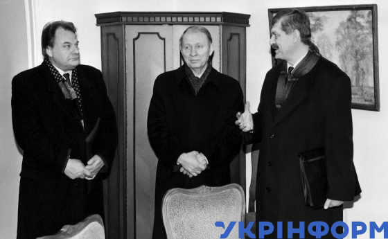 Президент України Леонід Кучма (у центрі) та міністр МЗС України Геннадій Удовенко (ліворуч) у межах Наради з безпеки та співробітництва в Європі (НБСЄ) відвідали посольство України в Угорській Республіці, Будапешт, грудень 1994 року. Фото Володимира Самохоцького.