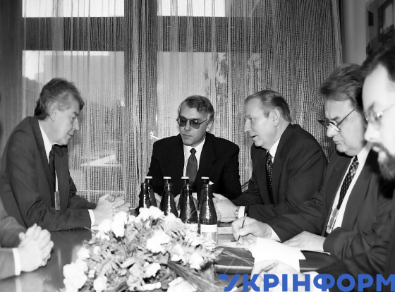 Президент України Леонід Кучма (третій ліворуч) та прем’єр-міністр Нідерландів Вім Кок (ліворуч) зустрілись у ході Наради з безпеки та співробітництва в Європі (НБСЄ), на якій підписано меморандум про гарантії безпеки у зв’язку з приєднанням України до Договору про нерозповсюдження ядерної зброї, Будапешт, грудень 1994 року. Фото Володимира Самохоцького.