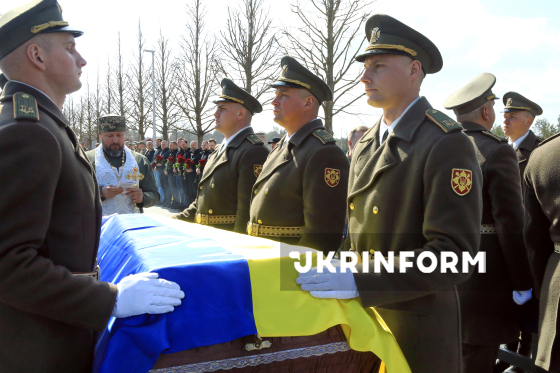 Капелан читає молитву над труною з останками невідомого захисника України під час церемонії почесного поховання невпізнаних тіл (останків) військовослужбовців та поліцейських, які загинули внаслідок збройної агресії проти України, на Національному військовому меморіальному кладовищі, Київська область, 28 березня 2026 року.
