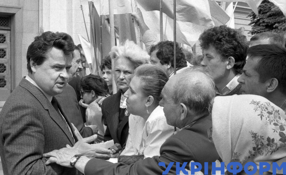 Перший заступник Голови Верховної Ради УРСР Іван Плющ (ліворуч) спілкується з киянами та гостями столиці біля будівлі парламенту у дні ухвалення Декларації про державний суверенітет України, Київ, липень 1990 року. Фото Анатолія Піддубного та Юзефа Мосенжника.