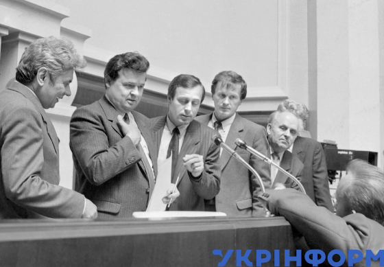 Перший заступник Голови Верховної Ради УРСР Іван Плющ (другий ліворуч) та інші депутати в залі засідань І сесії Верховної Ради УРСР 12-го скликання у дні ухвалення Декларації про державний суверенітет України, Київ, червень-липень 1990 року. Фото Юзефа Мосенжника.
