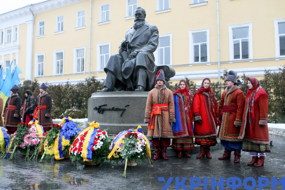 Учасники церемонії покладання квітів біля пам’ятника президенту УНР Михайлові Грушевському в День Соборності України та 90-ї річниці проголошення Акта Злуки Української Народної Республіки (УНР) і Західноукраїнської Народної Республіки (ЗУНР), Київ, 22 січня 2009 року. Фото Олександра Космача.